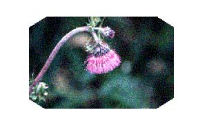Fさんが白馬山麓で撮影,先日の昼食会のとき貰ったものを甥 Tさん がスキャナに通して送信してくれました。普通は上を向いて咲いていますが,高山植物のアザミは下を向いて咲いており,茎が太く葉が小さいのが特徴でしょうか? 2000.08.19 |