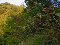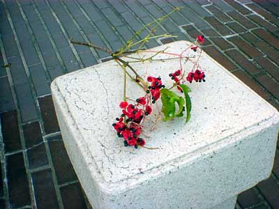 山の散策で見つけた赤い実、はじけて黒い種がのぞいていました。枝を少し持ち帰りフロントで尋ねてみましたが、名前は分かりませんでした。