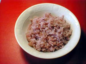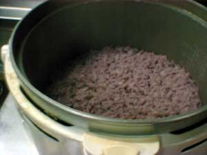 今日も(2004.01.24)ガス炊飯器でうるち米3カップに大さじ2杯の紫黒米を混ぜて炊きました。お酒少々とお塩を 加えるといっそう美味しく仕上がります。まるでお赤飯みたいでしょう。水加減は少し多めにします。 |