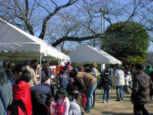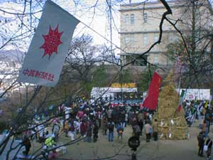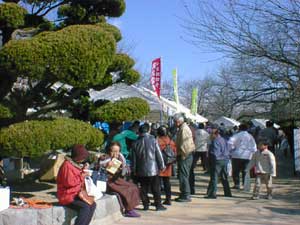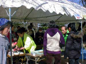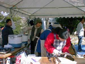 久しぶりの好天に恵まれて早くから会場を訪れた人達、島根県横田町からの応援出店の幟も見えます。 |