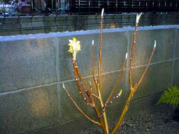 2階の窓より隣家の裏庭(白モクレンのつぼみ)