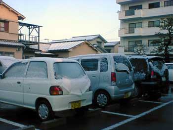 近所の駐車場 出勤前窓ガラスの雪を払って