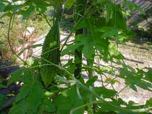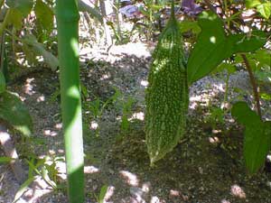 NHKの朝の連ドラ「ちゅらさん」の放映が始まった年(2001.04〜09)に、おなじみのゴーヤマンの苗を近所から 貰い植えたのがきっかけで、それから毎年種を採っておいては苗を育てて今年で4年、ひ孫の苗が育ち手の平 サイズのゴーヤが生り始めました。薄切りにして炒めても湯がいてもあの独特のほろ苦さが美味しく、すっかり 気に入っています。BSでドラマの再放送もされていてメルヘン調の物語もまた楽しみに観ています。 |
