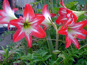 真夏の青空の下見事に開花した カサブランカ 東広島市志和のSさんから届いた暑中見舞いの メールに添付されていました 2004.07.29〜2004.08.15までindexに使用 |