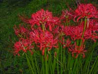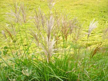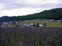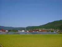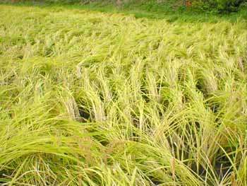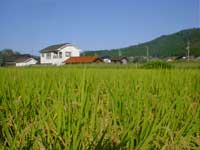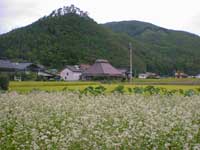 みどりもちと言う古代米は美しい薄紫色でラベンダーの花を連想します。白いそばの花も昔はよく見かけましたが 最近ふるさとでは余り栽培されていないようです。黄金の稲穂はたわわに実り、冷夏の影響は余り感じられませ でした。六つ並んだハウスではネギと菊の花が植えられているようでした。 |