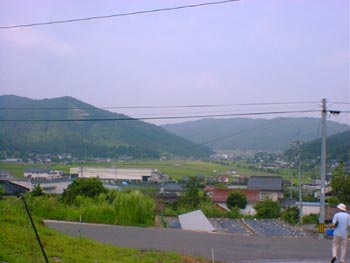 ふもとの道まで降りて来てほっと一息 上戸島正力方面を望む 画面右茶色の壁の家辺りにJR芸備線 左の長い白い屋根の工場前がR37号線 |