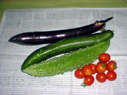 とうもろこし、里芋、ナス,オクラ、キュウリ、トマト、ピーマン、カボチャ、スイカ、アスパラ、ネギ、モロヘイヤ等々 美味しく幸せいっぱい。我が家のゴーヤも一役かって夏バテもせず元気に猛暑を乗り切れて感謝、感謝です。 |