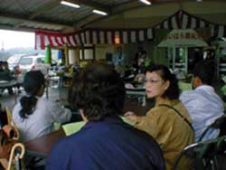 午後になっても雨は降り続き、どうしても植えて帰りたい人達 だけが、参加しました。 私は傘をさして見学しましたが、最初の2年は約半世紀ぶりに 泥んこの田に入って枠植えを体験し大変感動したのを覚えて います。 |
