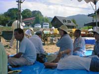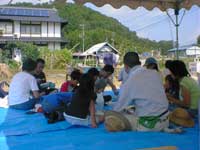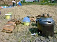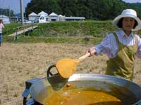 最後の精米は動力機械でしました。昔風にしているととても昼食に間に合いませんから・・・スタッフの方々準備の 蒔きで昔のお釜を使用してのご飯は、大変美味しく新米がキラキラと光っていました。大鍋のカレーをかけて種々のお漬物をテントの下で頂きました。暑いながらも時折田園を吹き抜ける風がさわやかな秋を感じさせてくれました。お盆の墓参から35日しか経っていないのに、ふるさとはすっかり秋の景色に変わっていました。 |