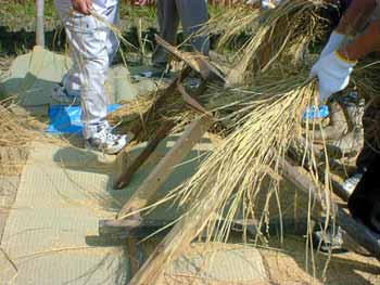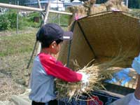 スタッフの方が用意してくださいましたはぜ掛けの稲を はずして、足踏み脱穀機2台で脱穀。 手回しのトウスで藁ゴミを飛ばしてモミにする。 今年も5〜6束体験しましたが、午前中から残暑厳しく 暑いのとしっかり持っていないと巻き込まれそうになるし で悪戦苦闘。根もとを開いて表裏こぐようにすると割合 上手くいくと思いました。 |