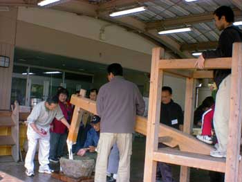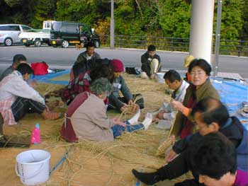 藁ぞうりや下駄は足の裏のツボを刺激して、健康にも良いと数年前から人気があるようですが、藁を水で湿らせ 槌で叩いて柔らかくし、縄をなう作業が初めですがこれがなかなか出来ません。昔の人は器用だったのですね。 交流館の売店で販売されている藁ぞうりの値段も納得出来たように思います。 |