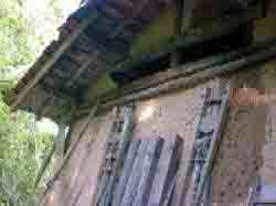 3月の芸予地震で、かなり傾斜の進んだ納屋の壁に 昔懐かしい木オイコが2つ掛かっていました。 肩にかける紐はとっくに朽ち果ててしまったようです。 |