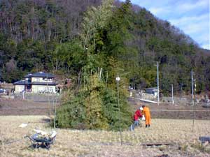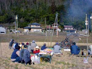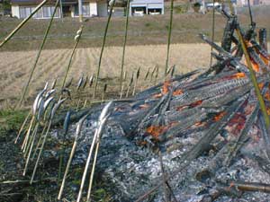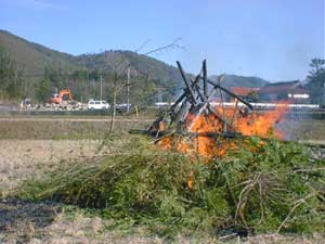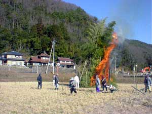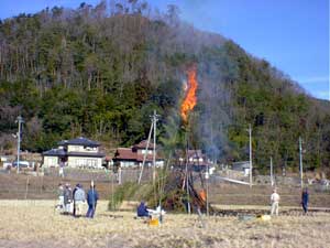 お正月明けの連休最終日(12日)は、本当に暖かい春日和でした。坂 8 区のとんど祭りの見学に今年はじめて 向原町に出向きました。昔はとんどと言えば1月14日の夕刻に決まっていたように思いますが、ここ最近は、休日 昼間にするところが多いようです。今年は11日(土)に済ませたところもかなりあったようでした。 |