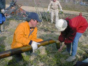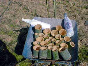 お餅が焼けるとぜんざいにして食べ、イワシは丸かじりお酒を飲んで夕方まで歓談しながら、一年の幸せを願い 講中の皆さんは親睦を図られるようです。4 年前に生家がとや(当番)の時以来のとんど祭りでしたが、今回の ようなビッグなのは初めての体験で結構楽しませて貰いました。ただ一つ物足りなく寂しく感じたのは、書初めを 上げる子どもの姿が一人も見られなかったことでした。(2004.01.12) |